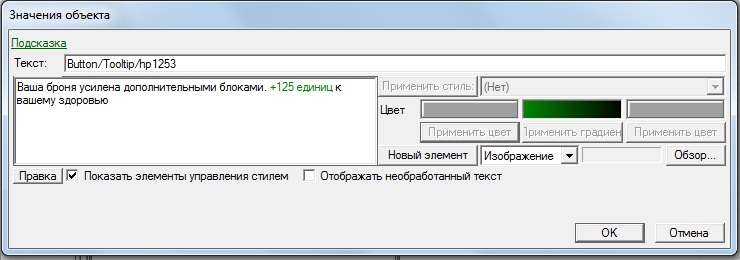 Поля Подсказка и Подсказка оповещения являются текстовыми полями. Текст в кнопке может иметь различное форматирование. Злоупотреблять редактором текста не стоит, но ради удовольствия можно побаловаться с цветами и шрифтами.