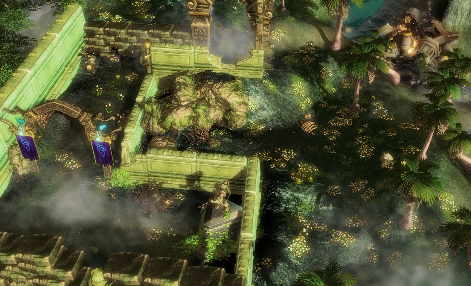 Что же, подумал я, придётся вспоминать вар3 и делать всё через заднюю точку. И это действительно сработало! Так как в ск2 по-дефолту уже есть прозрачные тайлы, стоило лишь в пропасти намалевать прозрачный тайл... и снова разочароваться, поскольку модель скайбокса просвечивалась сквозь туман. Решение пришло, как это обычно бывает, внезапно. Я просто взял обычный мост, увеличил и расплющил его, после чего опустил под землю.