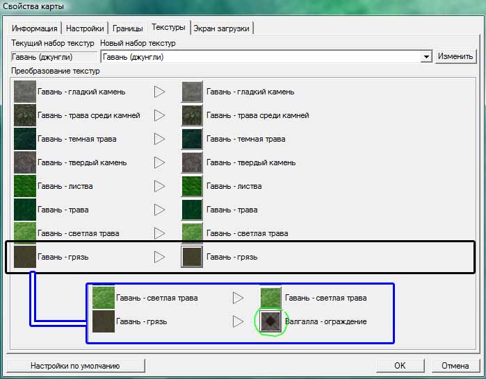 В появившемся окне вы видите два столбца с текстурами. В левом указаны стандартные текстуры из тайлсета «По умолчанию», а в правом те, которые используются вместо них на самом деле.