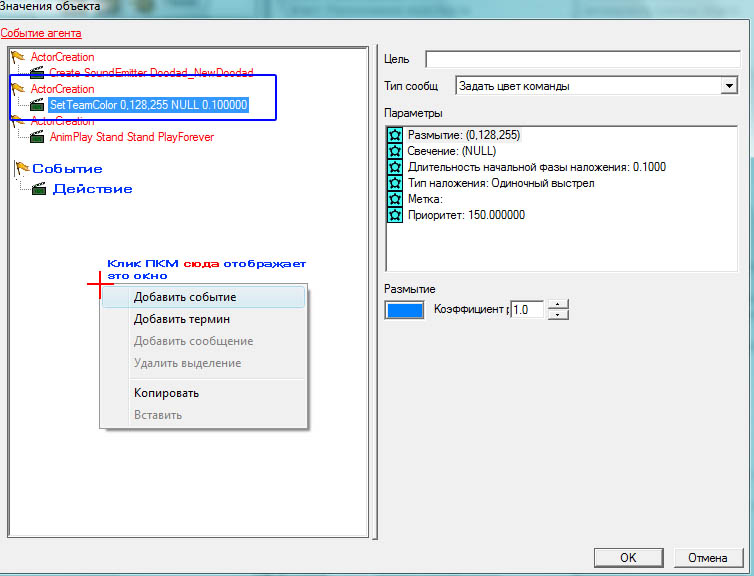 Теперь изменим стандартное действие "ActionImpact" на "SetTeamColor". Делается это аналогично, выберите этот пункт и из списка справа в поле "Тип сообщения" выберите "Задать Цвет команды".