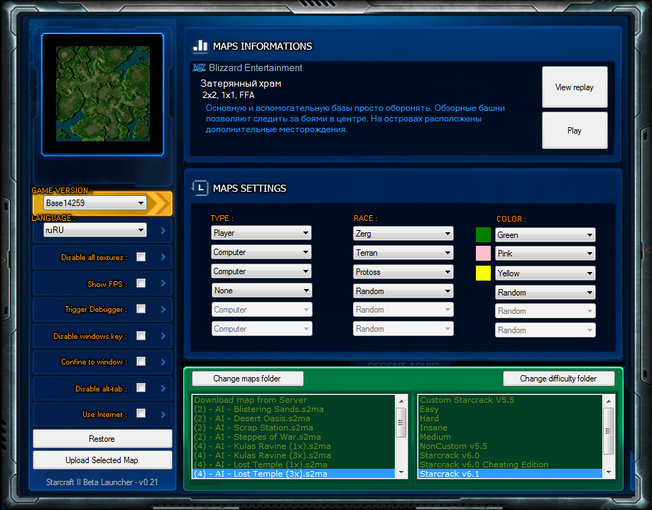 0.21-я версия лаунчера. Переделан интерфейс, появился выбор расы и цвета, а также возможность отключать "лишних" компьютерных игроков. Просмотр реплеев стал удобнее.