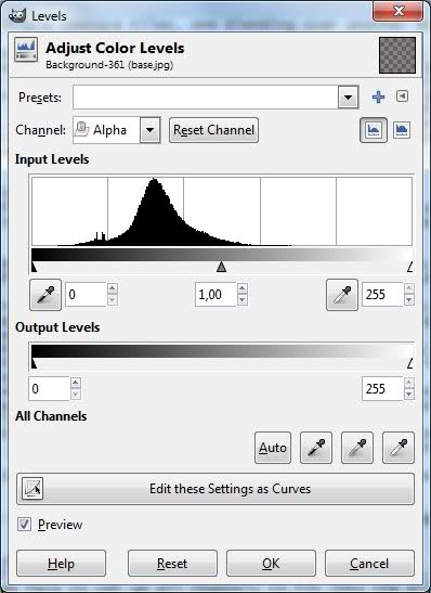 В моём случае, гистограмма уже являет собой единственную линию в левой части графика, т.к. альфа-канал равномерно заполнен почти чёрным цветом.