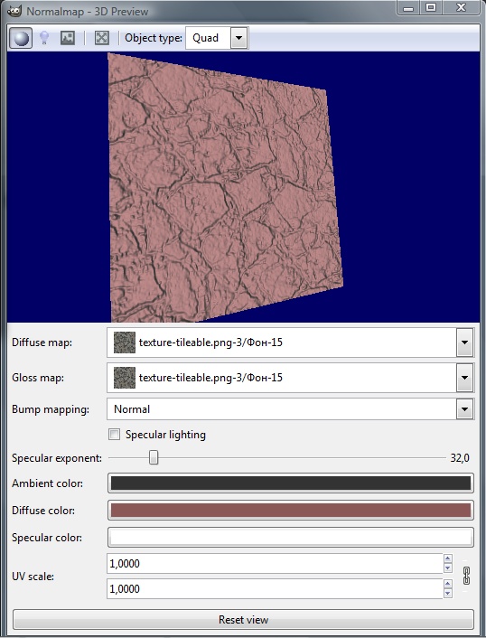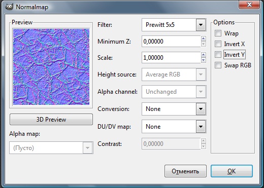Воспользуемся фильтром Normalmap, который мы установили ранее. Его можно найти в меню "Фильтры"\"Карта"\"Normalmap" ("Filters"\"Map"\"Normalmap").
