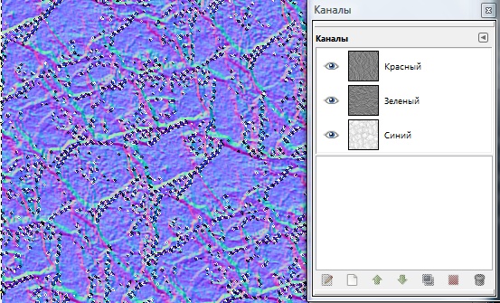 Можно заметить, что если мы отключим все каналы, кроме красного (нажимая на кнопки с изображениями глаз в соответствующих строках списка), то будут видны горизонтальные тени (как если бы источник света находился слева); если оставим только зелёный - тени будут вертикальными.