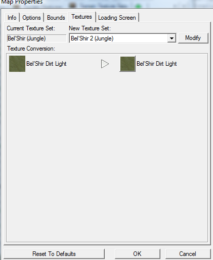 Для этого следует зайти в меню "Map"\"Map textures" и в открывшемся окне выбрать "Bel'Shir 2 (Jungle)" в качестве New Texture Set, после чего нажать Modify, затем ОК.