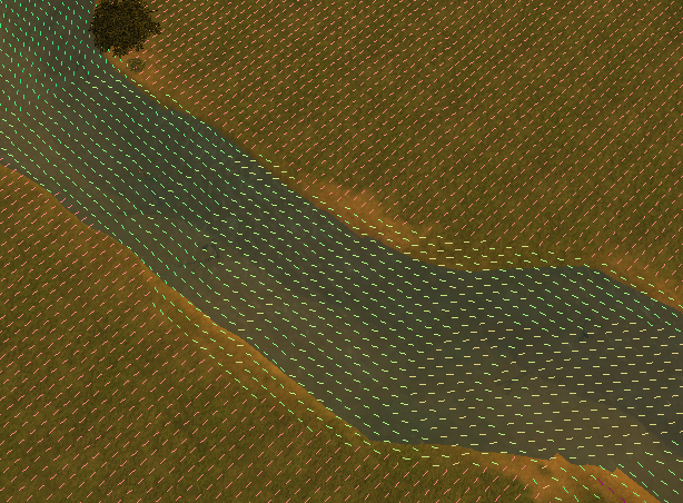 Сейчас можно заметить, что течёт река в сторону одного из берегов. Нужно это исправить. Для этого в меню вода - реки выберите "Настройку потока". Вся карта покроется маленькими чёрточками, которые обозначают направление течения. Ваша задача - провести вдоль течения реки кистью, чтобы течение стало правильным.
