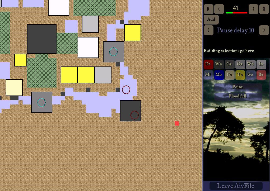 | Все остальные цветные квадраты. | Позваляют расставлять\удалять здания, стены, защитные сооружения и т.д. (Все наименования строений и юнитов, которые кстати написаны на английском, переведены, чтобы посмотреть перевод на зайти в папку с игрой и открыть текстовой файл "Перевод" |