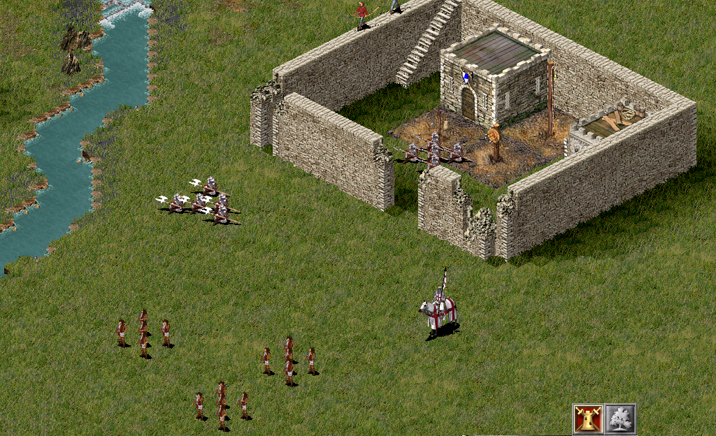 Результат: копейщики разведывают местность, ожидая нападения врага (оно будет позже). Теперь приказываем пикинерам патрулировать крепость, а рыцаря оставим в покое, поставив куда-нибудь возле казарм.