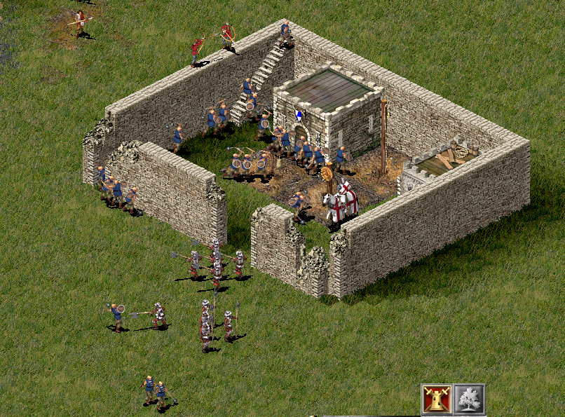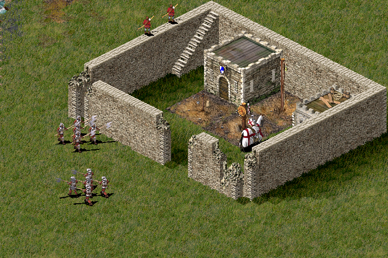 Я сделал небольшую крепость, уже потрёпанную предыдущими осадами, даже барбакана нет. Дырку в стене я сделал для удобства создания ИИ, о барбаканах расскажу позже. Особо много войск я решил не делать, но поставил туда два отряда стражи (пикинеров, я их часто как стражу использую), 3 отряда копейщиков-разведчиков и рыцаря.