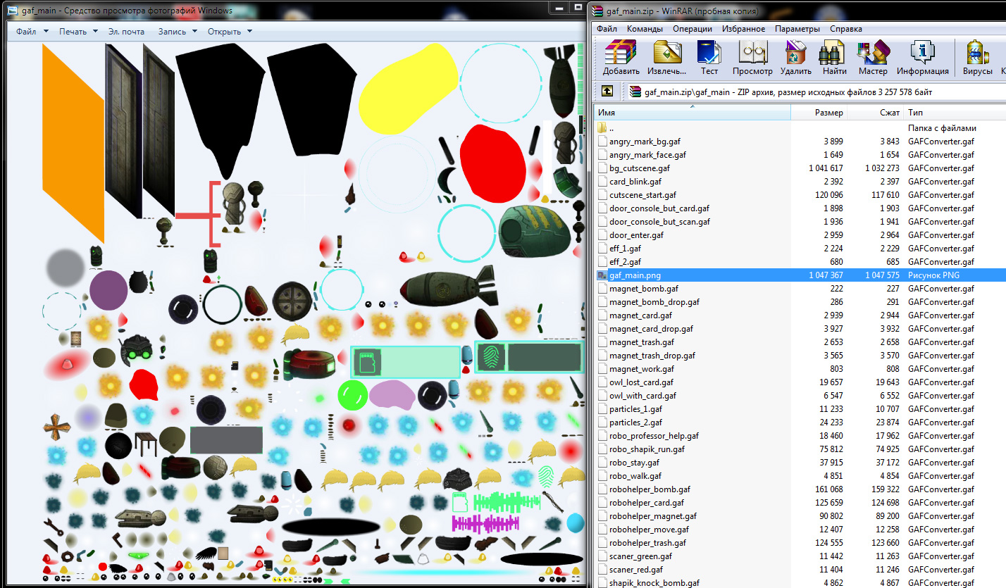 Достаточно непродолжительный серфинг в сети привел меня на сайт инструмента GAF, я пробежался по мануалам, взглянул на примеры и мне стало ясно - это то, что нам надо! Конвертация анимаций через GAF предлагала вполне логичное решение проблем, вместо того чтобы сохранять каждый кадр в виде отдельной картинки, GAF сохранял лишь один атлас с изображением каждого используемого в анимации элемента, а саму анимацию сохранял в отдельном файле собственного формата, в котором хранилось описание всех трансформаций, этих элементов. Я побежал загружать GAF-Converter…