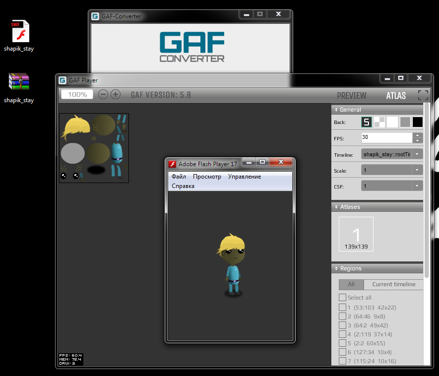 Работать с GAF-Converter оказалось очень просто, достаточно было сохранить анимацию в виде отдельного swf файла и перетащить в конвертер, после чего на выходе получался сформированный zip архив, содержащий текстурный-атлас и файл описания анимации.