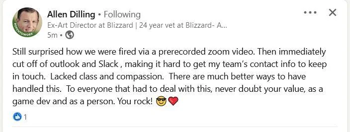 Зимой этого года, на 25-й год карьеры, мужика внезапно выгнали на мороз, отправив ему в Zoom заранее записанный видосик с пожеланиями дальнейших творческих успехов и предложением реализовать свой креативный потенциал в других проектах за пределами компании. Вроде как разогнали целую команду, где он числился арт-директором.