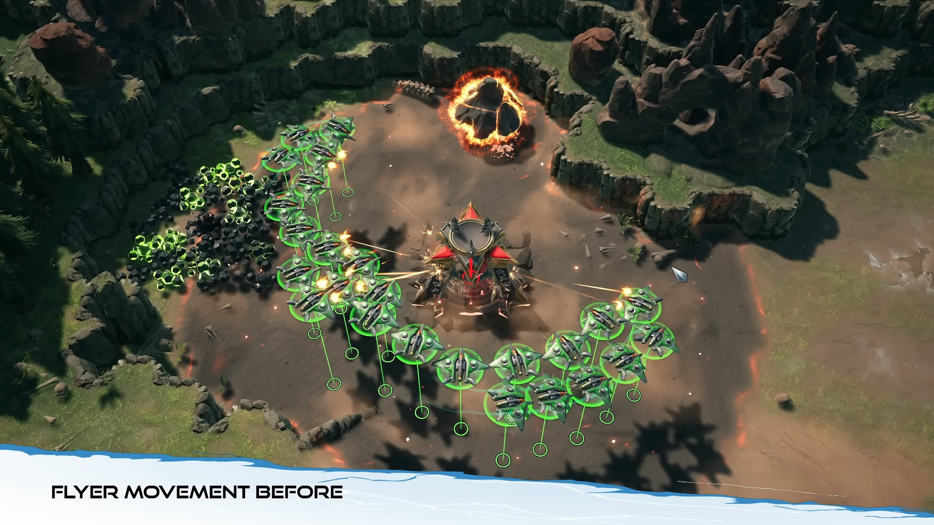 Изменено поведение воздушных юнитов. Ранее они двигались также как и наземные, перемещаясь толпой и толкаясь друг в друга. Теперь добавлено стайное поведение, что позволяет группе летающих юнитов проходить насквозь союзников, и слетаться в одну точку.
