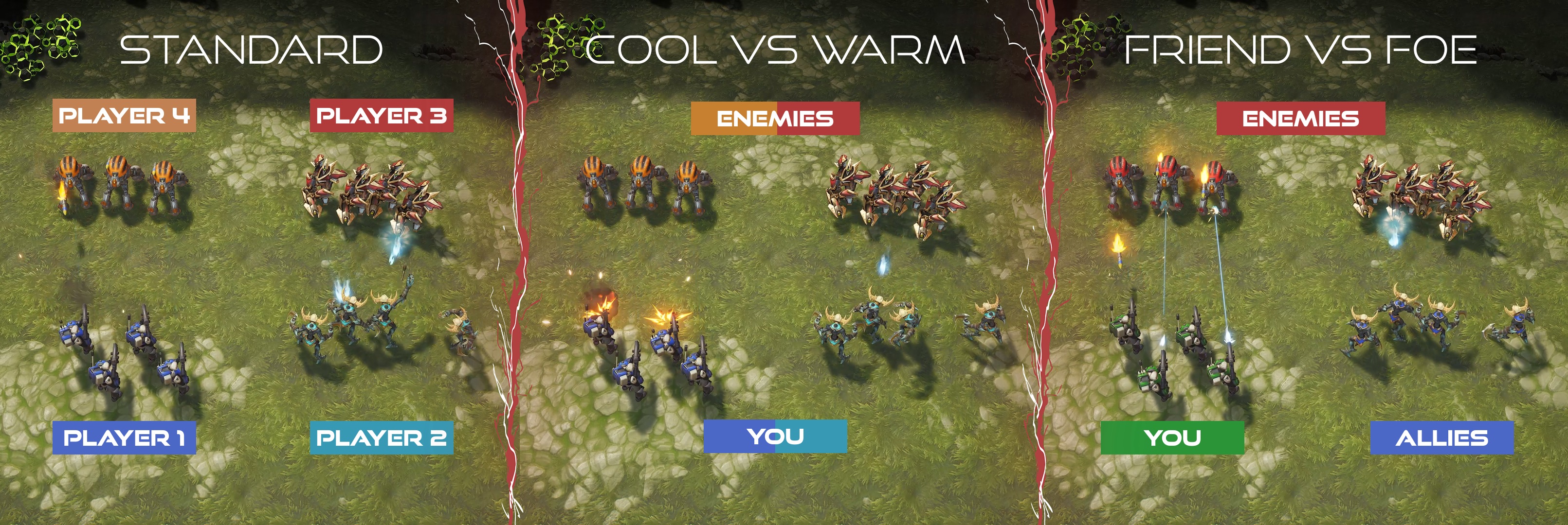• Холод против Тепла. Назначает вам холодный набор цветов, а вашим врагам — тёплый набор цветов. Так, в матче режима «Versus» каждый игрок будет видеть себя синим, а другого — красным.