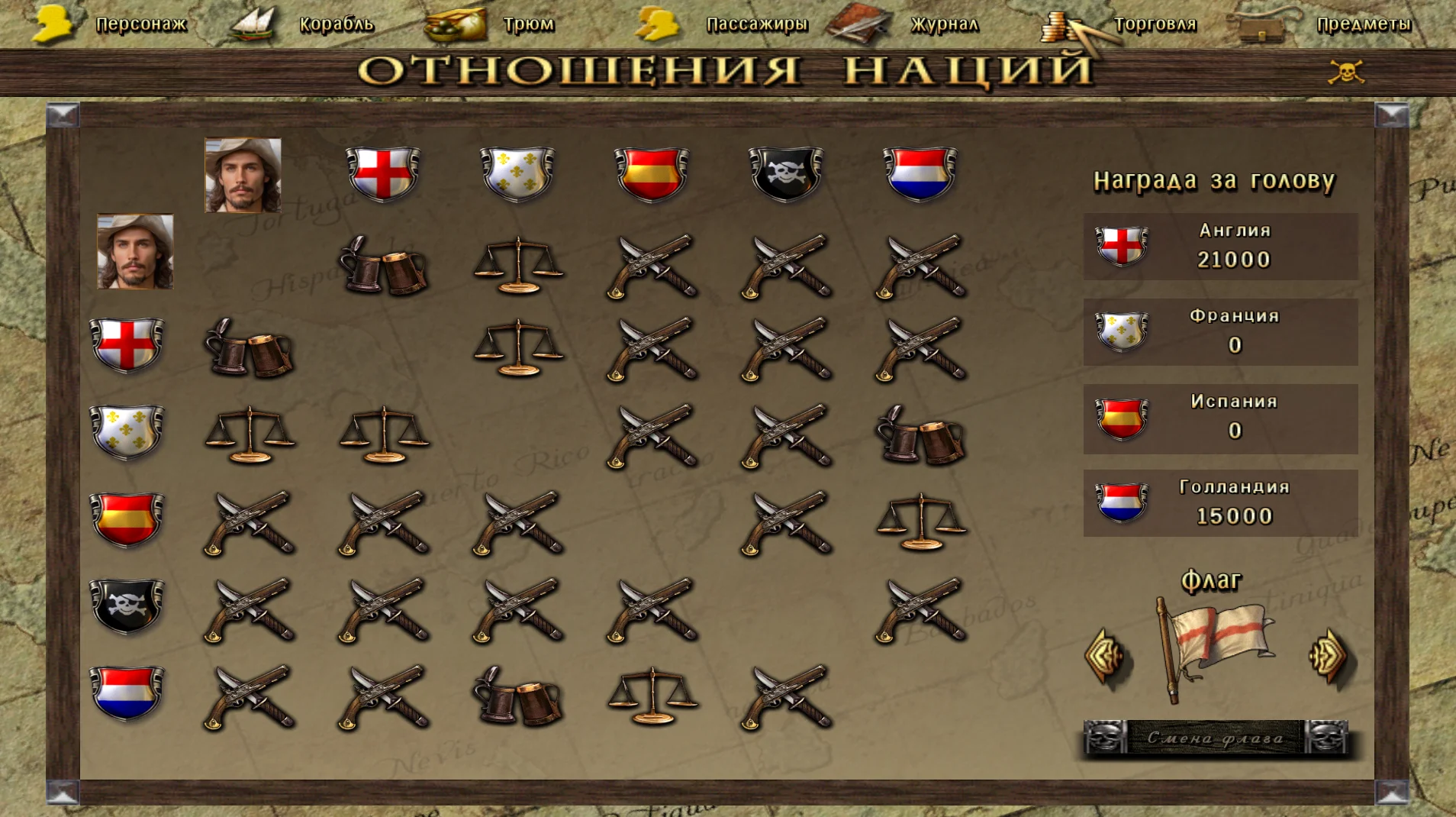 - на глобальной карте на корабле героя будет разный флаг такой, как был на корабле в море до перехода на карту. Ранее всегда был черный флаг, даже если герой - это патентованный корсар на службе Его Величества. Смена флага через интерфейс Нации на карте флаг на кораблике не заменит сразу, но в море потом будет новый.