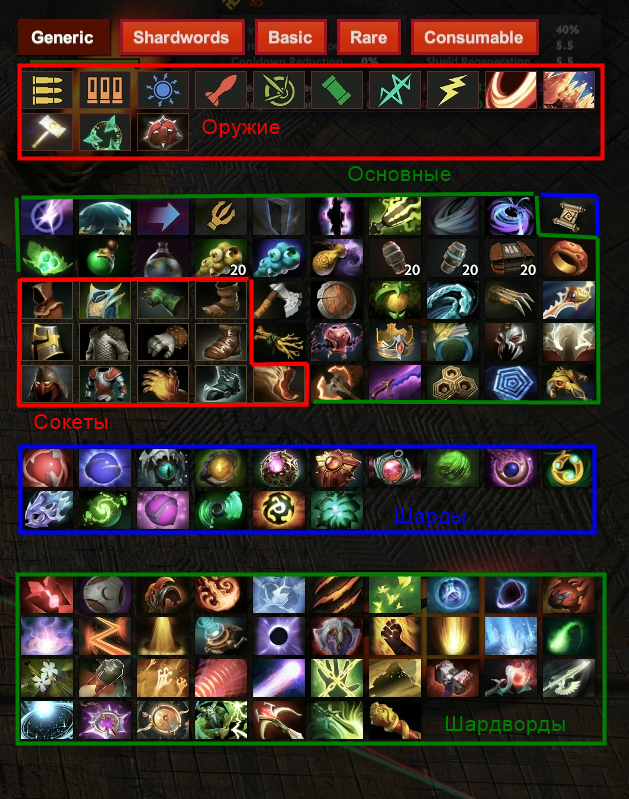 - Шарды: сами камешки или же руны, называть можно как угодно, но они ничего не дают, работают только находясь внутри предмета типа "Сокет"