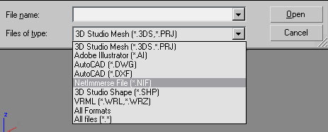 Чтобы установить импортер вам нужно просто поместить единственный файл NifImport.dli в каталог, где размещаются плагины 3D Studio Max (Max\plugins\). После этого, в меню File -> Import появится опция "NetImmerse (*.NIF) ".