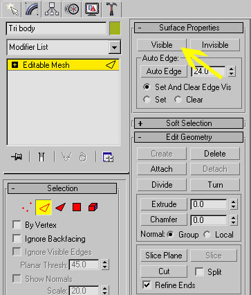 Как вы заметили, меш можно видеть только в окне перспективы (perspective viewport), но не в других трех проекциях. Нам нужно сделать его грани видимыми. Выделите меш, чтобы стали видны его границы, затем, удерживая левую кнопку, мышкой очертите ею окно, чтобы выбрать все грани, затем кликните на кнопке "Visible" в меню "Surface Properties".