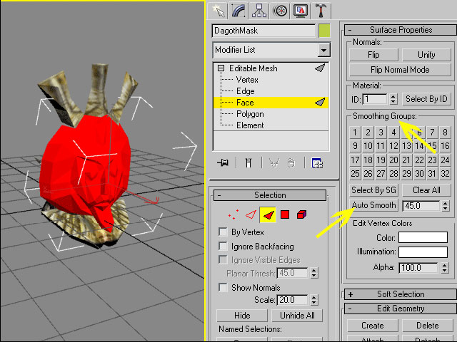 Любое сглаживание, которое было наложено на объект, будет потеряно при импорте. Для того, чтобы вернуть его, выберите опцию face (грань) в окне редактирования вашего меша. В меню "Surface Properties" вы можете выбрать опцию "Auto Smooth" (Автоматическое сглаживание) или выбрать грани, чтобы добавить их к группам сглаживания. Повторите эту операцию для всех мешей и убедитесь, что вы сняли выделение с пункта face, перед выполнением следующего шага.
