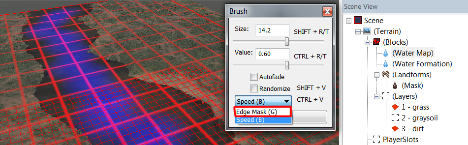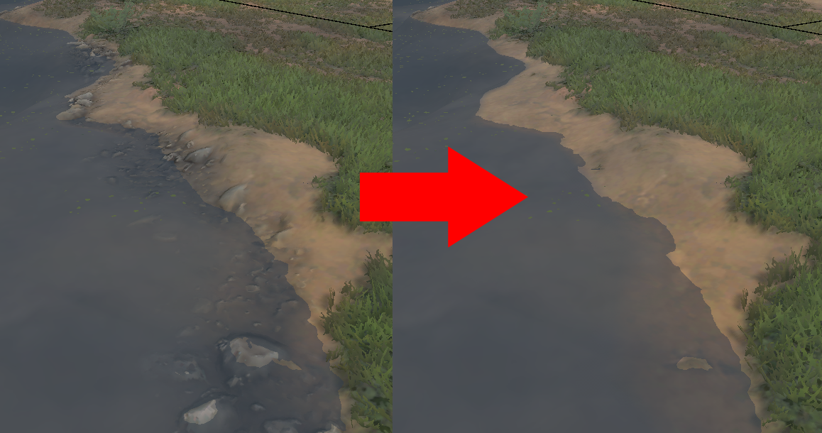 Edge Mask предотвращает автоматическое наложение текстуры “WaterEdgeTerrainType” (камни) вдоль береговой линии: