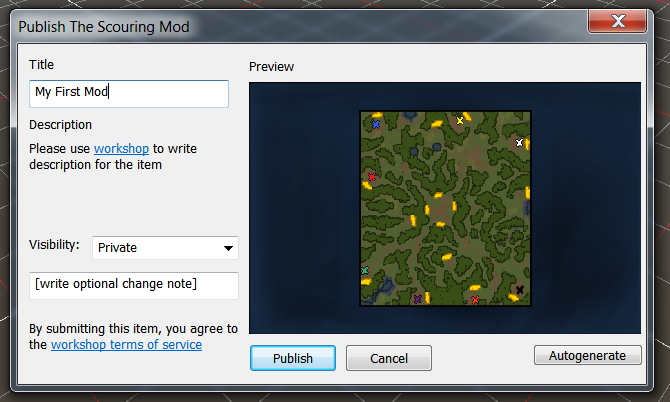 Введите title (название), нажмите “Autogenerate”, чтобы создать файл предпросмотра, и “Publish” (опубликуйте) мод: