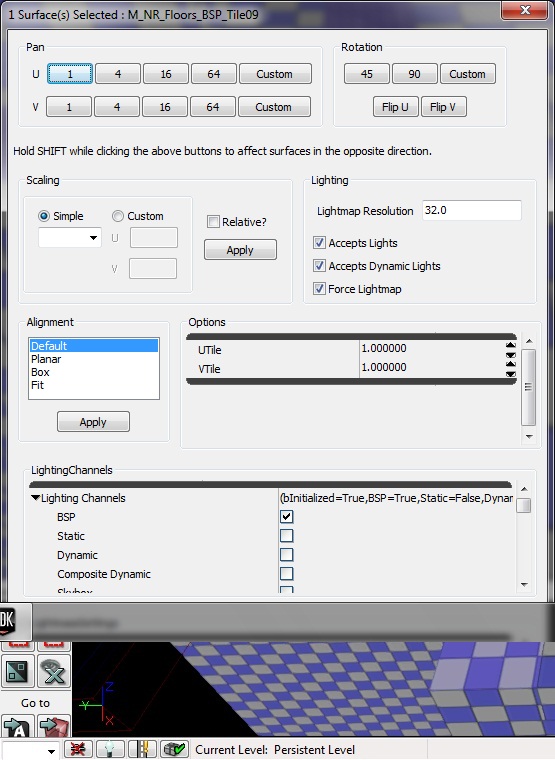 Итак, для основной поверхности меша-основы нам пригодится материал BSP_Tile09 из пака NR_Floors (ромбовидная плитка). Так как выглядит все это мелковатым, мы увеличим масштаб материала до 2.00 (как и у почти всех материалов в этой части статьи). Делается это в разделе Scaling окна свойств поверхности, который можно открыть а) пунктом Surface Properties в контекстном меню поверхности; б) горячей клавишей этого же пункта F5; в) банальным двойным щелчком по поверхности (разумеется, чтобы открыть свойства нескольких поверхностей, нам последний вариант не подойдет). В общем, скрин всего окна.