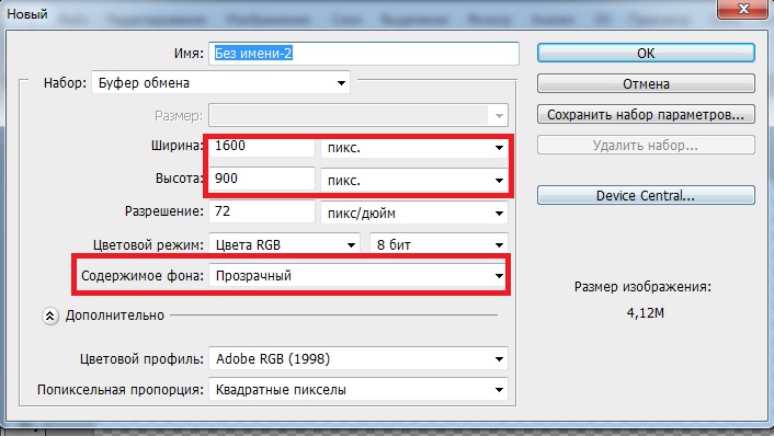 Начнём с того, что зайдём в фотошоп и создадим документ с прозрачным фоном. И нужным разрешением.