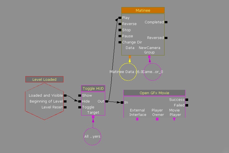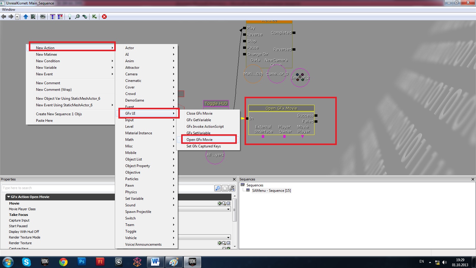 Далее выводим на экран наше меню в формате SWF. В поле Movie вводим название и путь к файлу swf, которое мы импортировали в UDK.