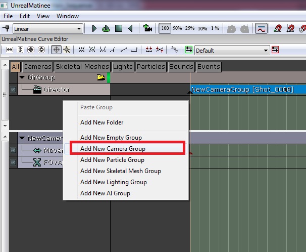 Далее жмём New Matinee и два раза мышкой по блоку матин, нам откроет инструмент Matinee, жмём в левой части правой кнопкой и выбираем Add New Director Group. Появится разделение на две строки. Теперь в строке, что под DirGroup жмём правой кнопкой и выбираем Add New Camera Group.