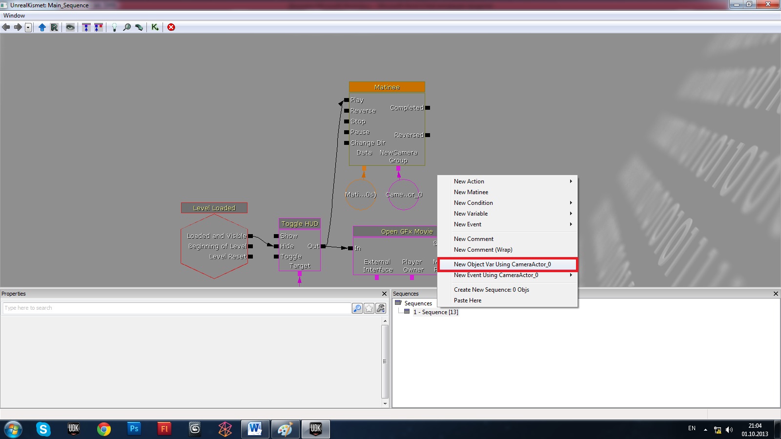В окне 3D вида UDK выделяем камеру и переходим в кисмет, жмём правой кнопкой и создаём переменную камеры.