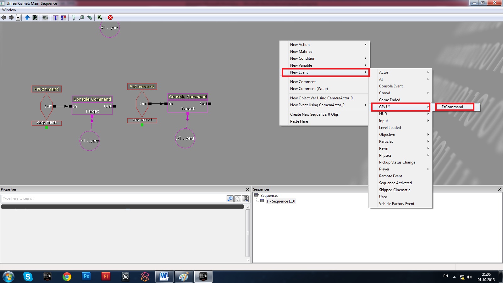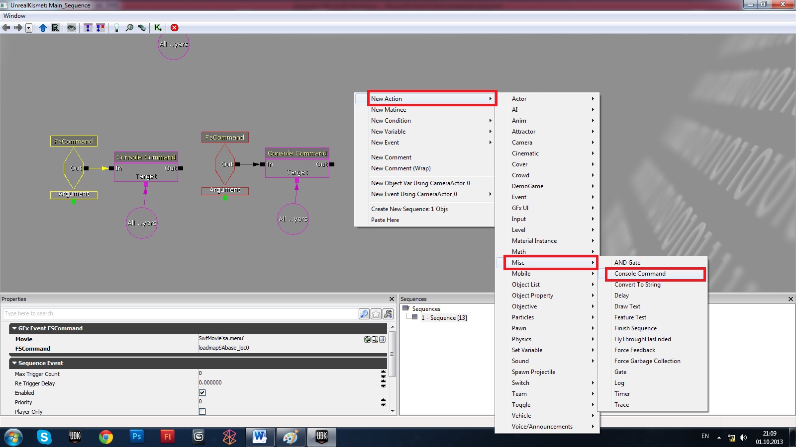 Теперь нам надо добавить два ивента FSCommand (New Event – GFX UI - FSCommand), к ним подключить Console Command (New Action – Misc – Console Command) и переменную All Players