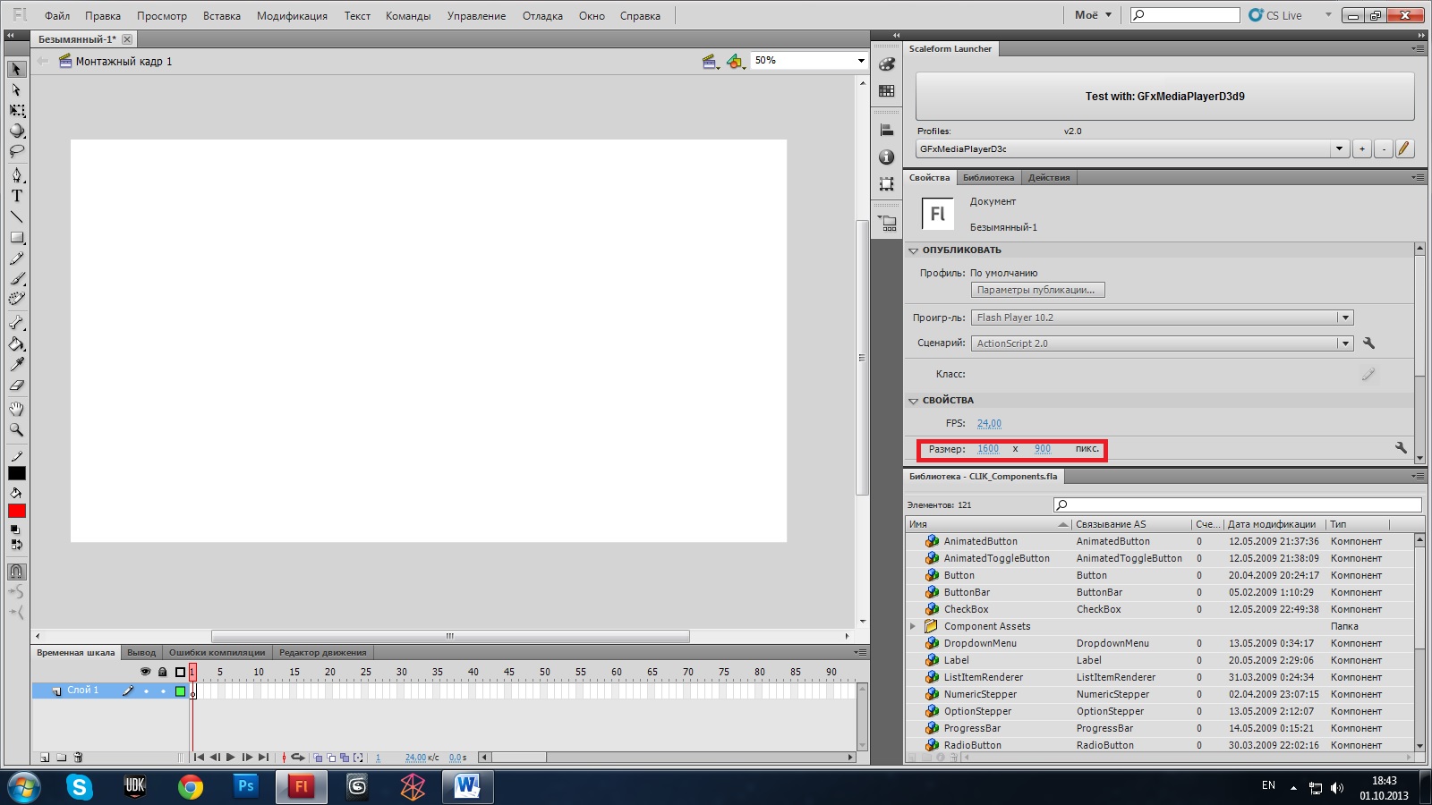 Теперь заходим в Adobe Flash Professional CS5.5, создадим новый документ ActionScript 2.0 . Выбираем разрешение (у меня 1600х900).