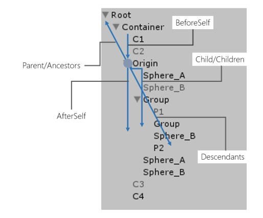 origin.Descendants(); // Sphere_A, Sphere_B, Group, P1, Group, Sphere_B, P2, Sphere_A, Sphere_B