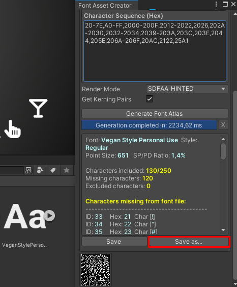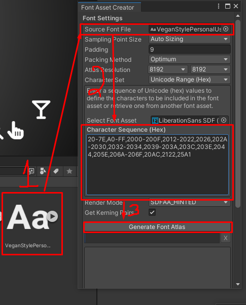- Вставьте в "Character Sequence (Hex)" Unicode стандартных Font Asset: