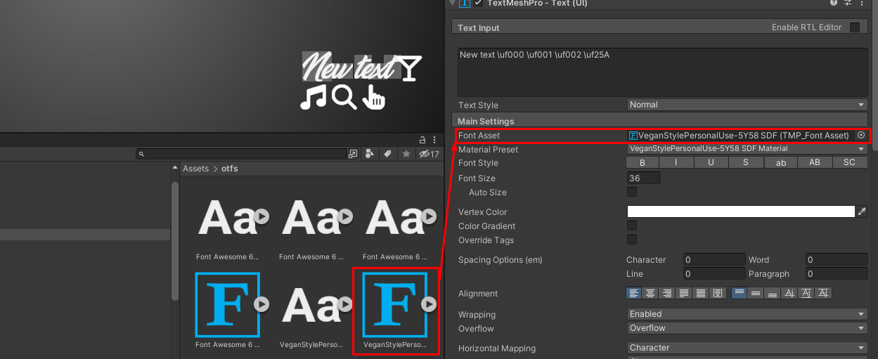 - Добавьте к списку "Fallback Font Assets" Font Asset от Font Awesome