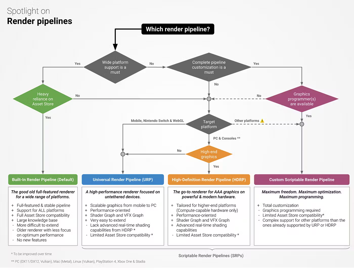 - High Definition Render Pipeline (HDRP): HDRP предназначен для создания высококачественных визуальных эффектов, таких как фотореалистичная графика, физически корректное освещение и т. д. Он требует больших вычислительных ресурсов и может быть неэффективным на мобильных устройствах, но хорош для ПК и консолей.