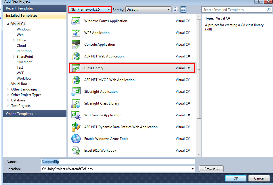Для создаваемой DLL укажите платформу .NET Framework 3.5 (сейчас это нужно лишь для того, чтобы потом не пришлось удалять ссылки на не поддерживаемые библиотеки).