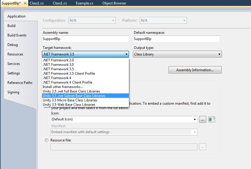 Теперь измените вашу платформу на Unity 3.5 .net Subset Base Class Libraries.