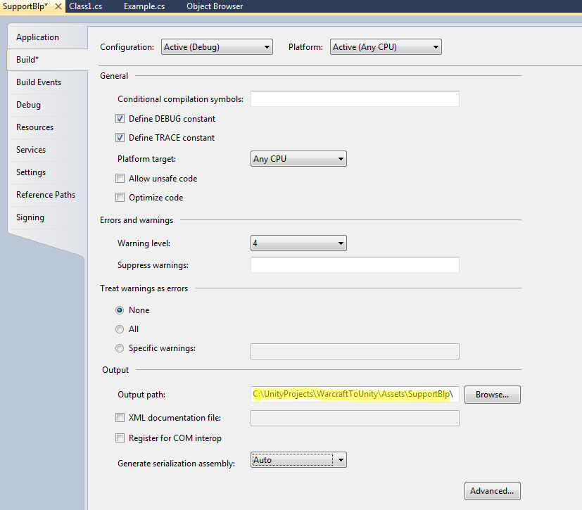 На вкладке Build установите путь для вашей DLL, куда она отправится после компиляции. В качестве папки укажите любую папку в папке Assets вашего проекта.