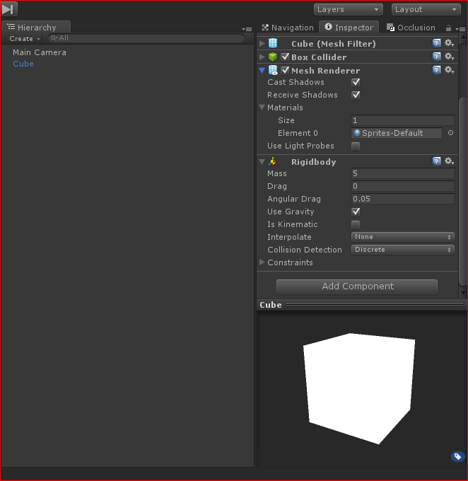 - Создаем куб и вешаем на него компонент rigidbody