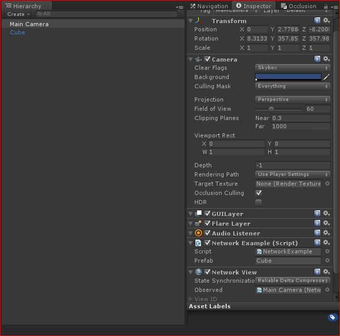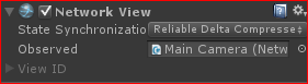 - На объект MainCamera Вешаем компонент NetworkView и перетаскиваем скрипт NetworkExample в Observed что-бы получилось вот так:
