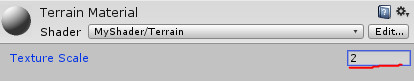 Назначьте вашему материалу шейдер MyShader -> Terrain, затем поменяйте у ландшафта стандартный материал, на ваш: