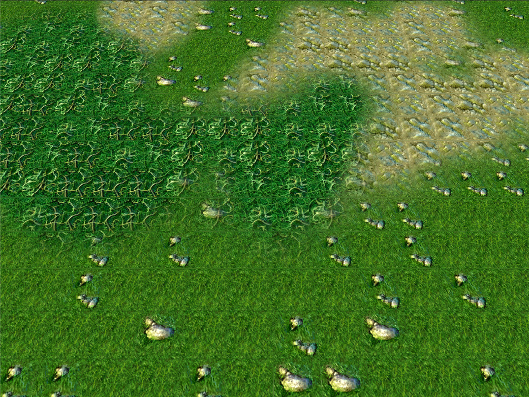Я на самом деле изначально схитрил, объединив 4 тайла в одну текстуру... теперь моя идея заключается в следующем: порезать каждую текстуру на 4 куска, и вместо самой текстуры выводить рандомно взятый кусок.