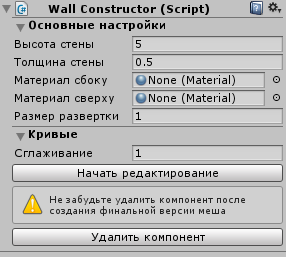 На сцене создался новый игровой объект "Wall". В инспекторе у этого объекта есть несколько свойств, которые отвечают за параметры стены в целом. Настройте их по своему усмотрению.