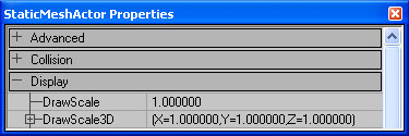 Имеются несколько путей вычисления статических предметов. Первый путь - используя DrawScale3D значения в основном меню свойств. Мы не должны волноваться относительно статических предметов, создающих отверстия в нашем уровне, так что вы можете использовать десятичные значения здесь без волнения за последствия. Второй путь — использовать инструмент Actor Scaling в левом меню, нужно делать всё также, как делали при вычислении Active Brush. Обратите внимание, что если вы используете этот метод, вы будете должны сделать Build Geometry, чтобы увидеть изменения. Третий способ вычисления масштабов статических предметов во всех трех направлениях сразу. Щёлкните правой кнопкой и выберите свойства StaticMeshActor, или щёлкните два раза по нему. Откройте вкладку Display и прокрутите вниз до значений DrawScale. Значения, введенные здесь изменят масштаб. Обратите внимание, что значения DrawScale3D ниже - такие же самые, как те в основном меню.