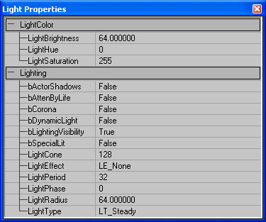 Свет также может быть установлен, для использоваия эффекта в всплывающем меню Light Effects, но LE_TorchWaver, LE_FireWaver и LE_WateryShimmer уже не используются (Используйте Projectors вместо этого). Вы можете также заставить их мерцать или пульсировать, выбрав один из эффектов из вслывающего меню Light Type. Экспериментируйте, чтобы увидеть что делает каждый из них. Еще раз, вы должны помнить, что не стоит злоупотреблять этими эффектами.