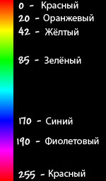 Оттенок Освещения(Light Hue) — это значение изменяет цвет освещения, которое может быть задано от 0 до 255. Следующая диаграмма должна помочь вам при выборе цвета освещения.