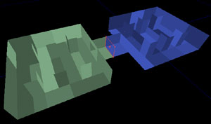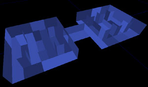 Add Special — Главным образом не используется, единственная вещь на которую мы собираемся обратить внимание - Zone Portals (Зональные двери). Давайте посмотрим на нашу карту снова, на сей раз я добавил переход и другую комнату в конец. Нажмите кнопку Zone/Portal во вкладке видов, в 3D виде, и вы увидете, что полный уровень — вся одна цветовая группа. Движок игры видит полный уровень как одну зону.
