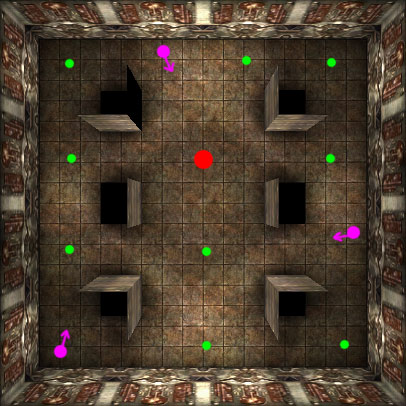 Этого достаточно для человеческих противников чтобы играть на вашем уровне, но боты будут главным образом стоять, если конечно вокруг они не видят противника, либо оружие или боеприпасы. Компьютерный интелект не достаточно силён, чтобы быть способным понять в какую сторону идти или где именно идти, так что мы должны сообщить ему, как ориентироваться по нашему уровню. Более сложные вещи, наподобие трамплинов и подъёмников здесь не будут обсуждаться, но я покажу вам, как сделать простую сеть дорожек для ботов, чтобы они могли ориентироваться. Функция, которую мы будем использовать находится в NavigationPoint » Pathnode. Они используют изображение яблока, и оно должно быть расположено на пересечениях дорожек, по которым вы хотите, чтобы они ходили. Амуниция и Оружие действуют на ботов так же как и точки ориентирования, так что вы не должны помещать их здесь. На следующей картинке, я промаркировал места появления игроков фиолетовым, а оружие красным. Чтобы сделать ботов способными пробежать все проходы, я разместил точки для ориентирования ботов, которые отмеченны зелёными точками.