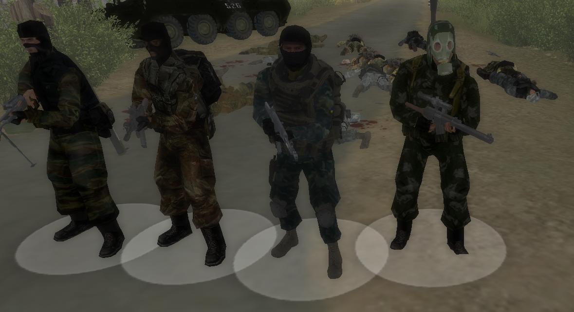 слева направо-руский штурмовик,солдат альфа,украинский морпех и руский разведчик)
